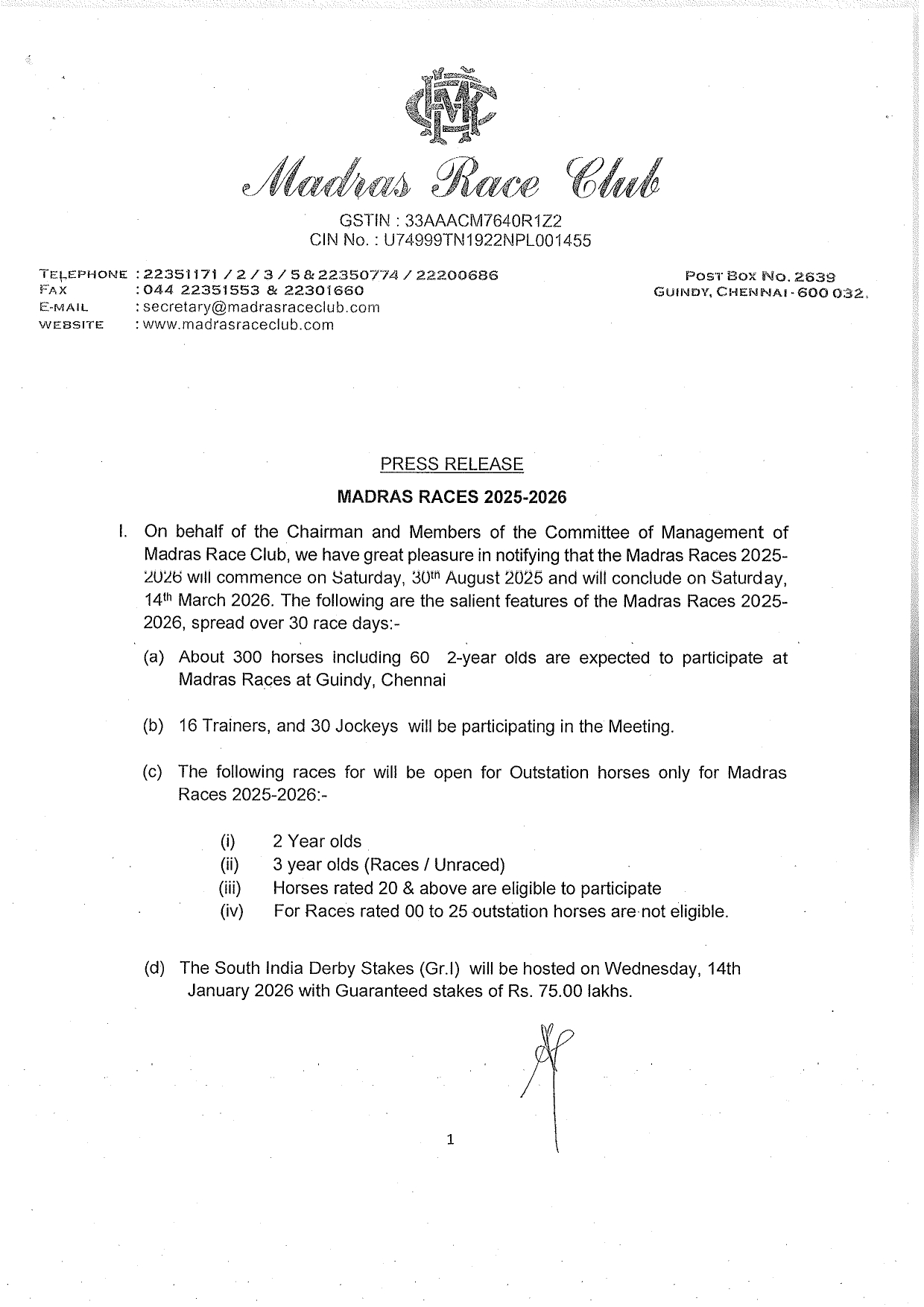 - By MADRAS RACE CLUB