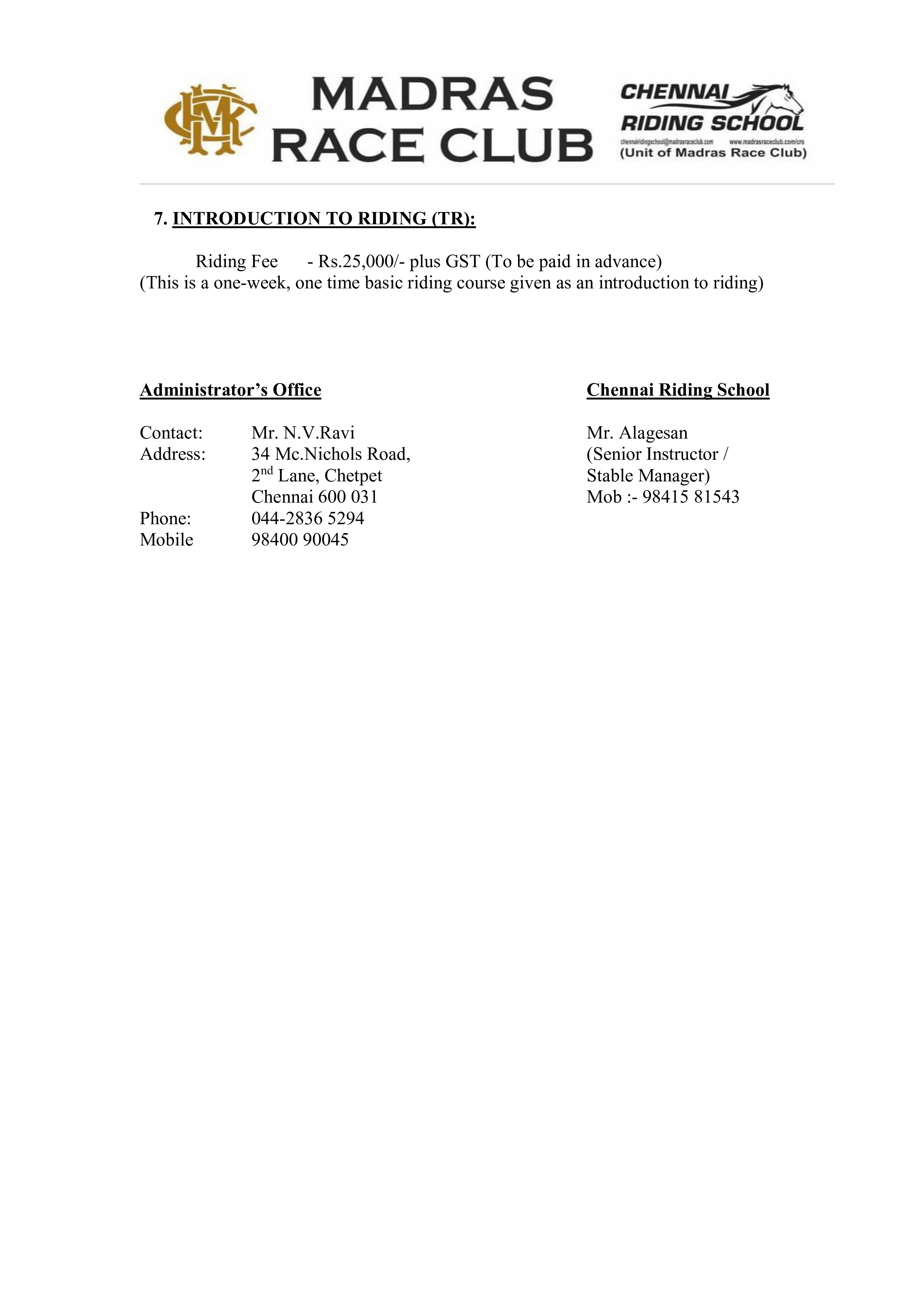 h. Riders of Chennai Riding School are not eligible / entitled for any facilities at the Madras Race Club or Guindy Lodge.